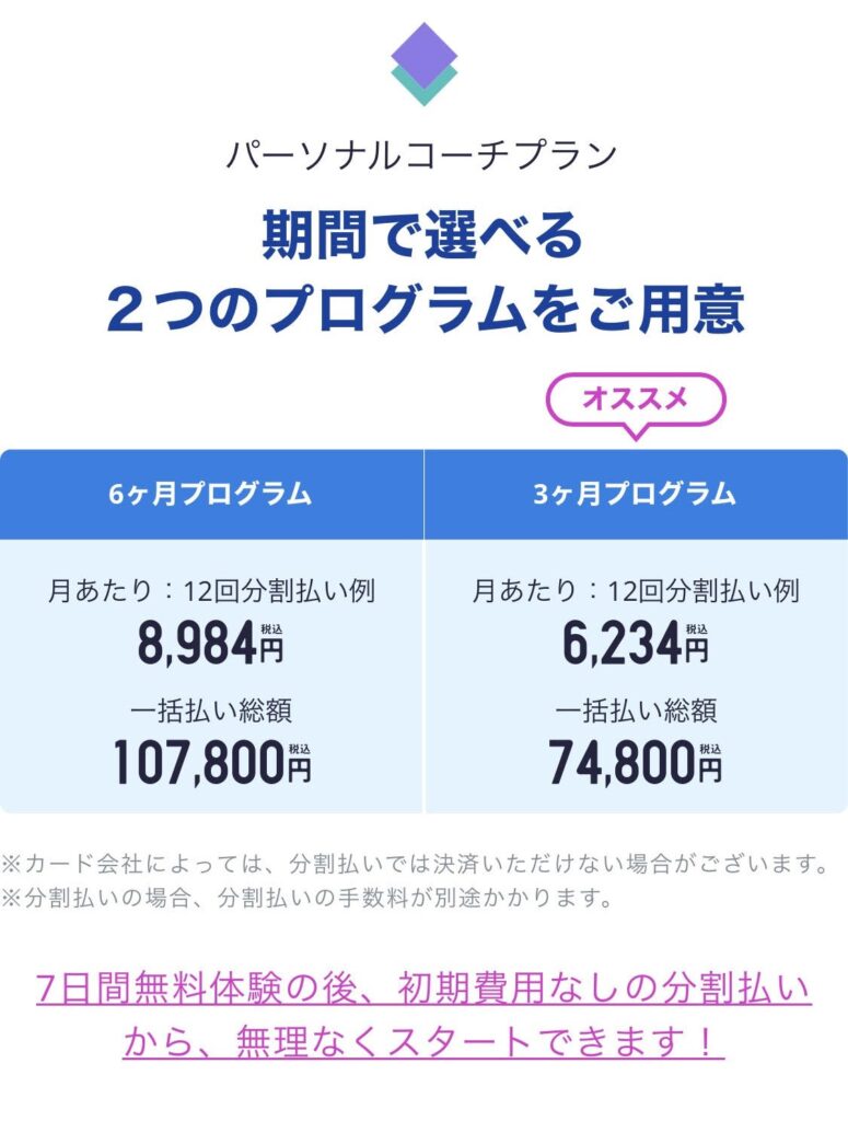 | 価格 | 【3ヶ月プログラム】74,800円(税込) 【6ヶ月プログラム】107,800円(税込) 7日間の無料お試し期間付き |