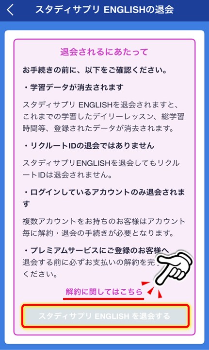 退会にあたる注意事項を確認し、「スタディサプリENGLISHを退会する」ボタンをクリックします。
